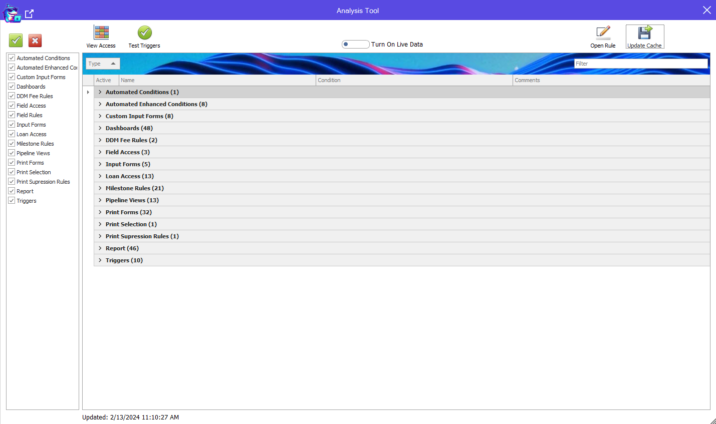 Setting Analyzer allows you to Open and Search through all Business Rules, Custom Print Form document text, Custom Input Form text, Dashboards, Reports and more!